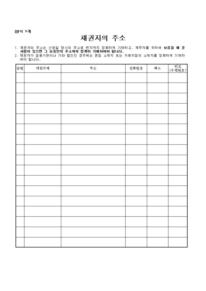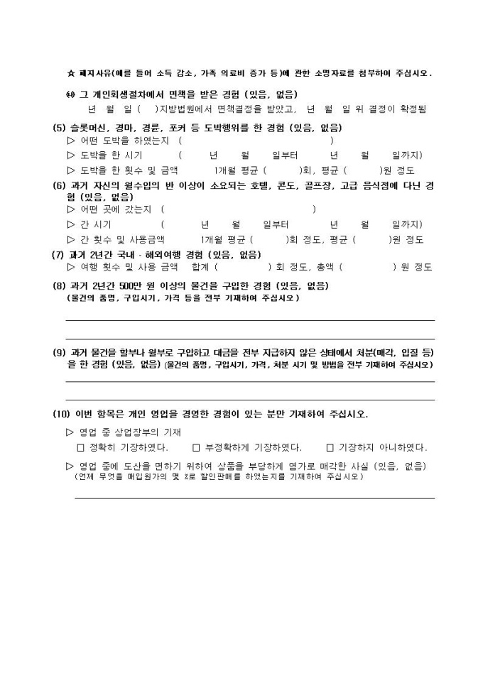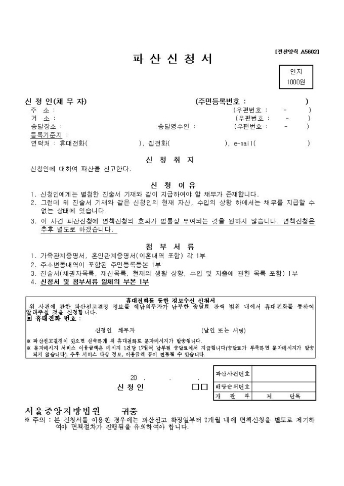 개인파산신청서(채무자) 양식(서울중앙지방법원용)