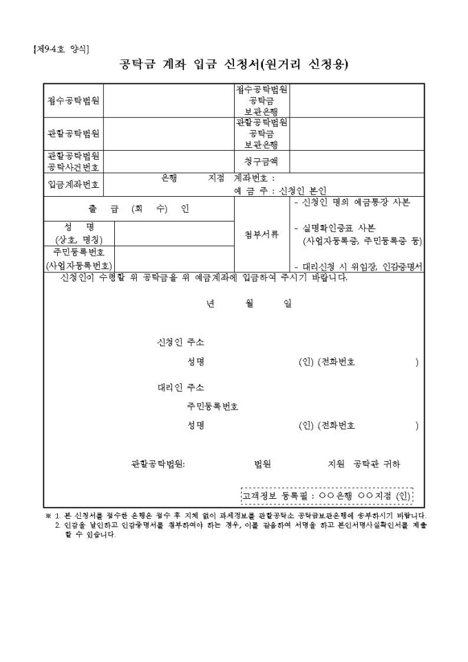 공탁금 계좌 입금 신청서(원거리 신청용)