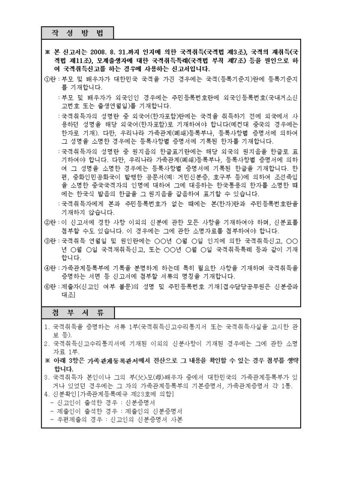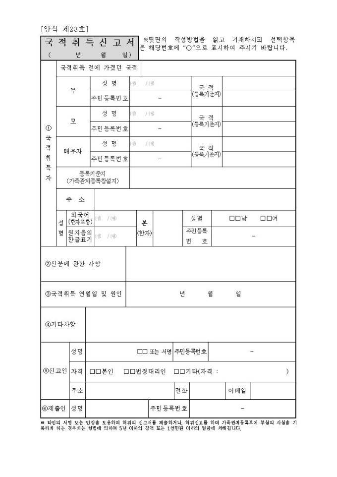 국적취득신고서(시구읍면사무소 제출용)