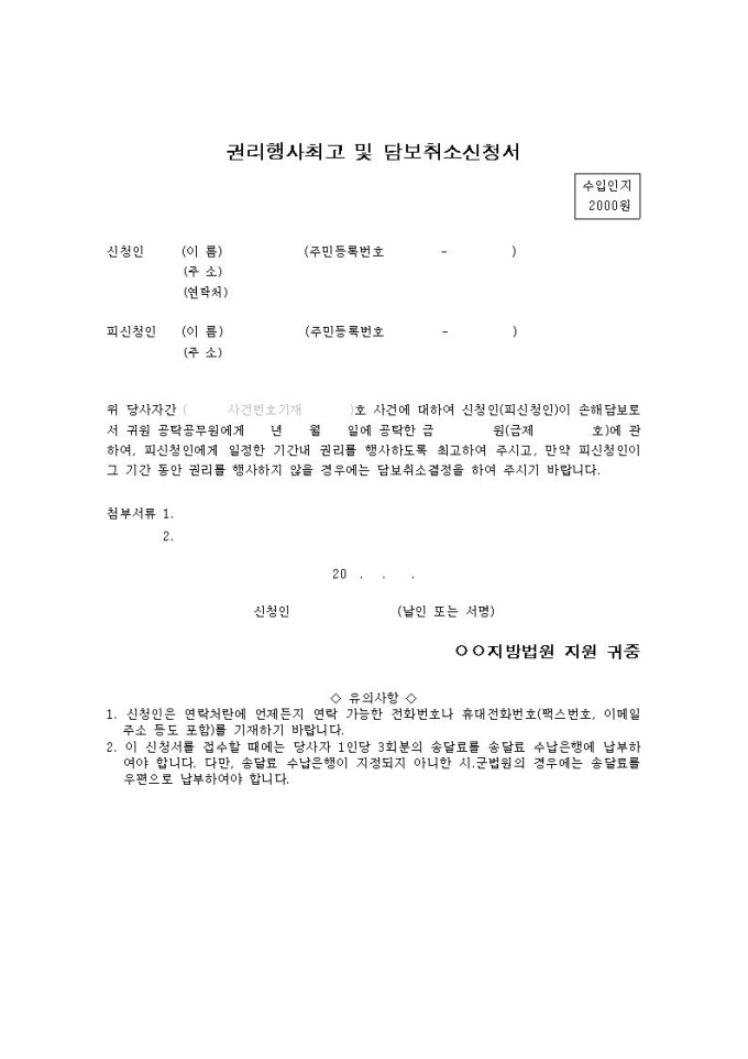 권리행사최고 및 담보취소 신청서