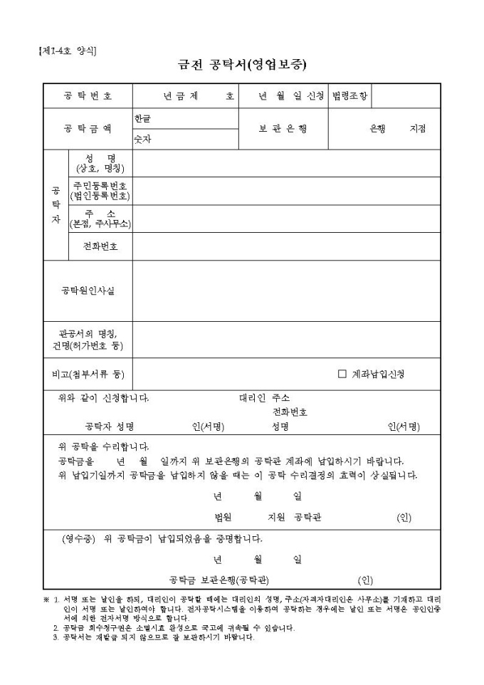 금전 공탁서(영업보증)