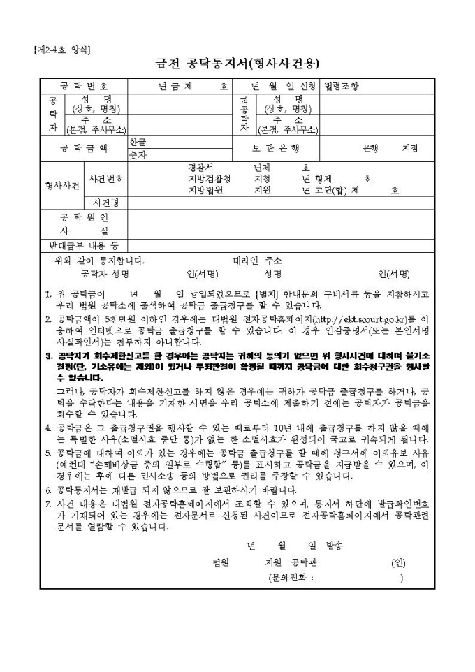 금전 공탁통지서(형사사건용)