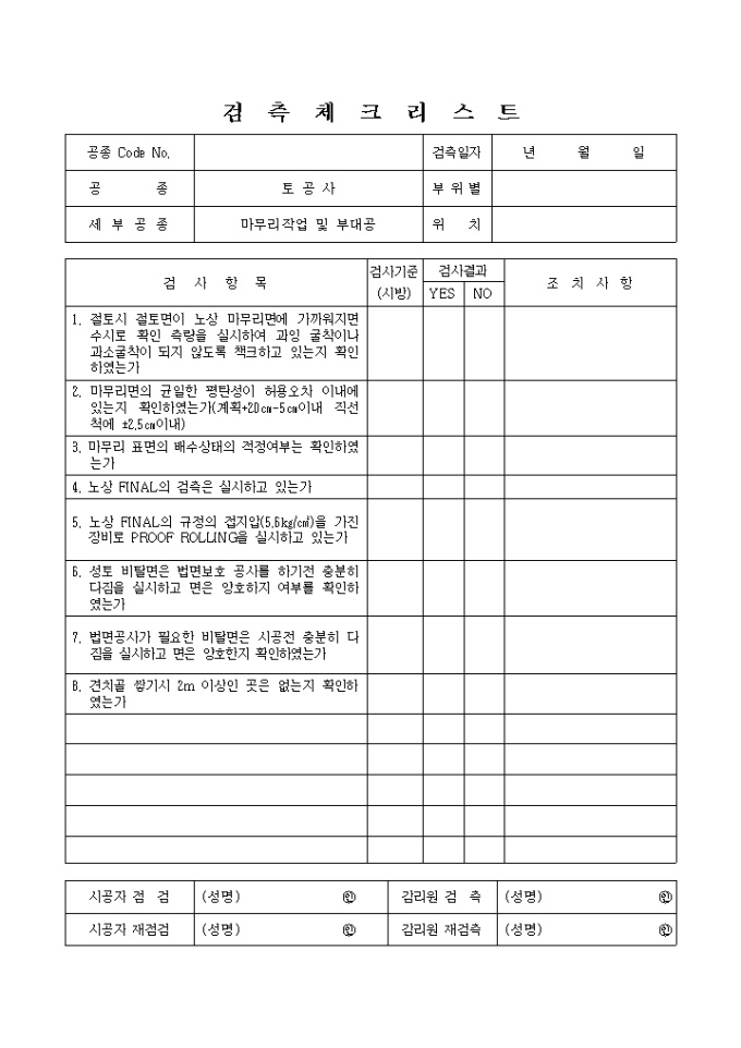 부대토목공사,마무리작업및부대공 체크리스트 입니다.