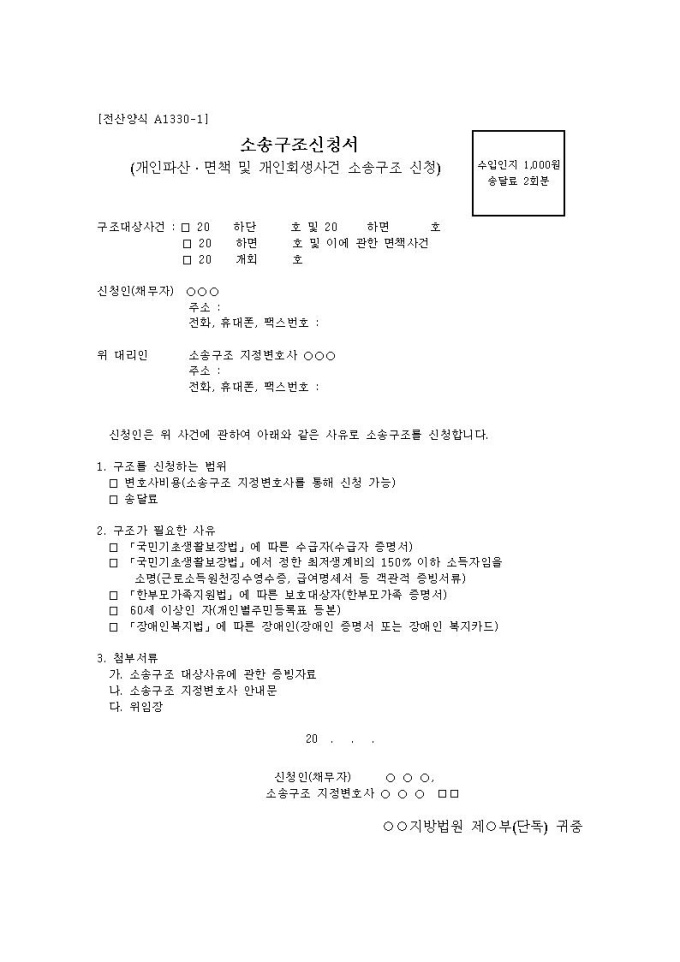 소송구조신청서(개인파산,회생사건 지정변호사 소송구조 신청)