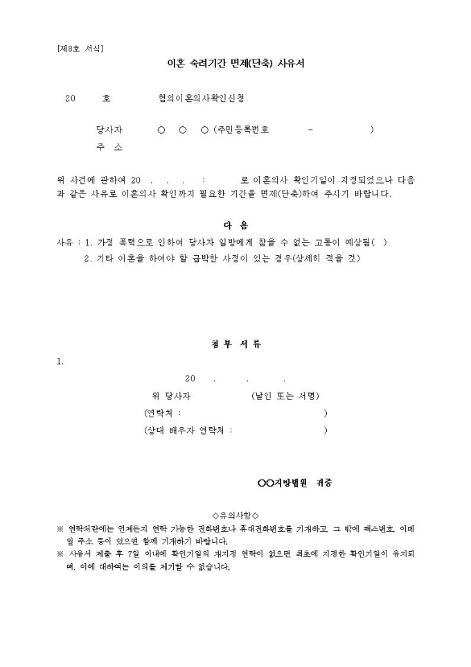 이혼숙려기간 면제(단축) 사유서(법원제출용)