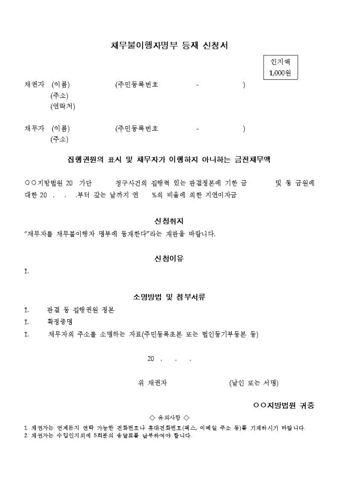 채무불이행자 명부 등재신청서