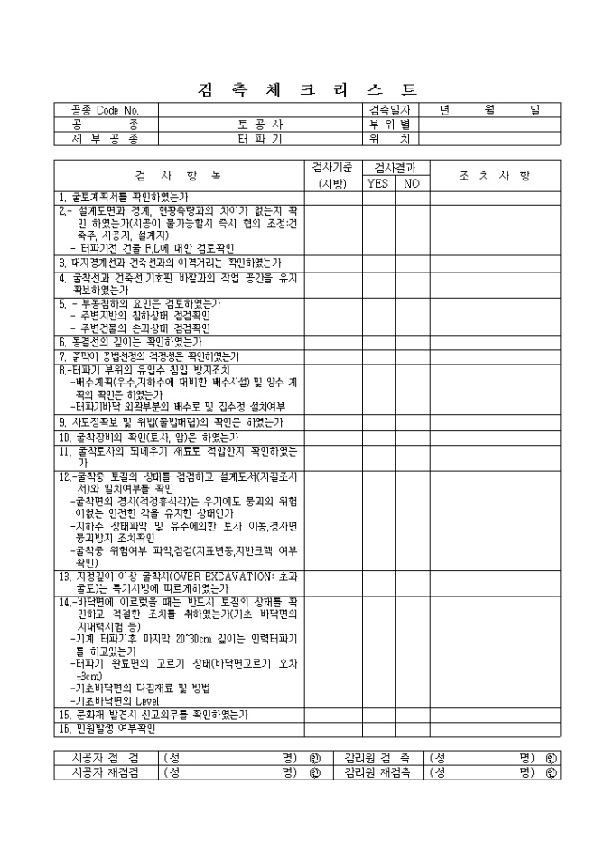 부대토목공사,터파기① 체크리스트 입니다.