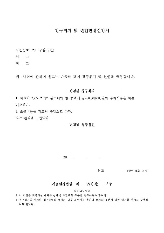 청구취지및원인변경신청서(행정)