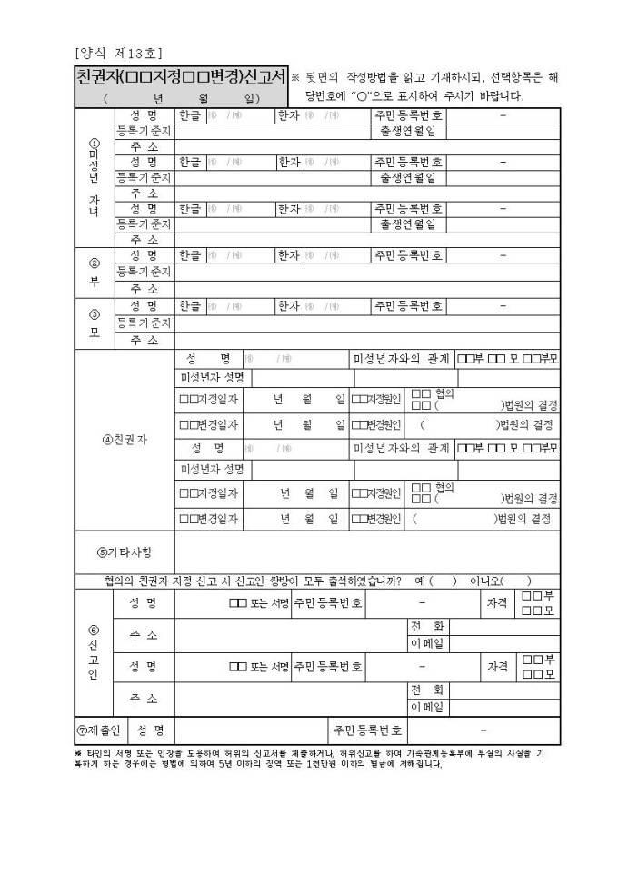 친권자(지정,변경)신고서(시구읍면사무소 제출용)
