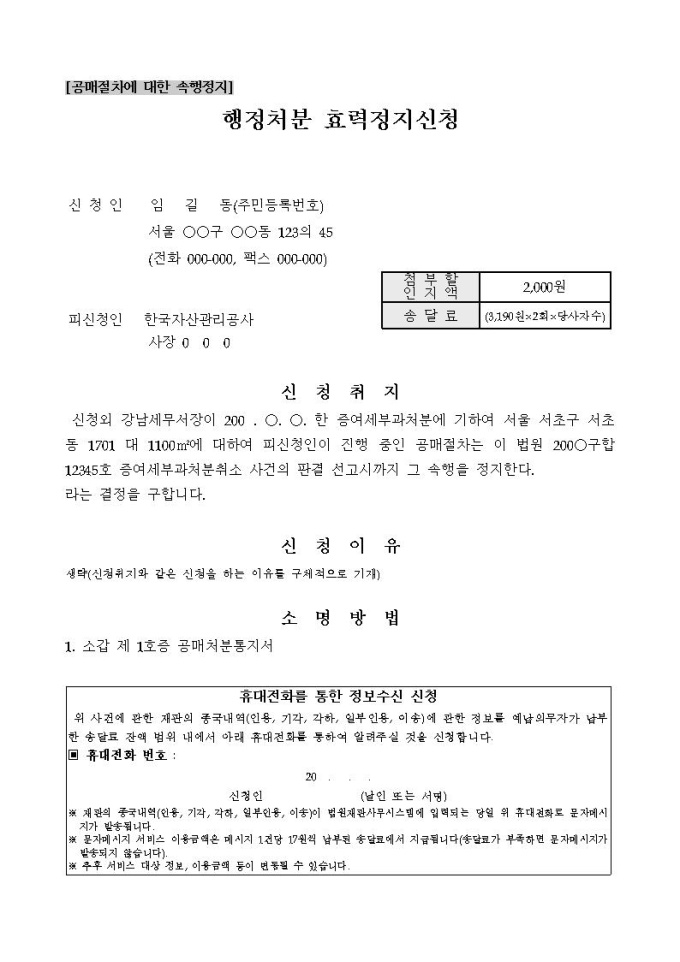 행정처분 효력정지신청서[공매절차에 대한 속행정지]