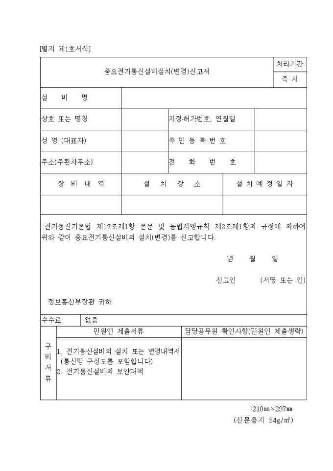 중요전기통신설비설치(변경)신고서