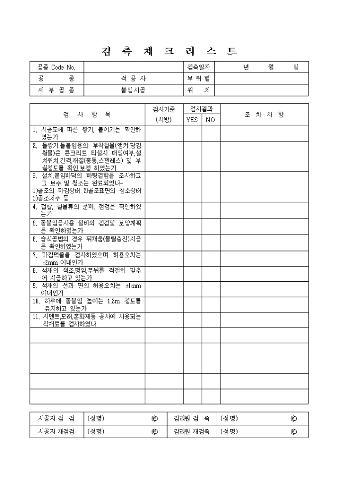 9,000원/월시멘트벽돌공사,돌공사,붙임시공 체크리스트 입니다.