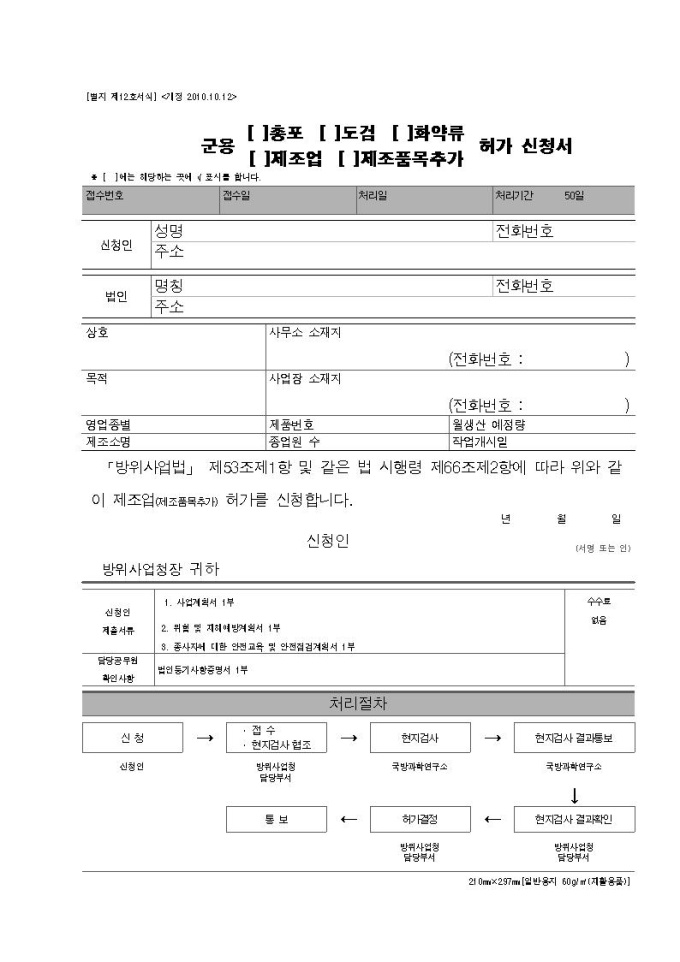 군용총포·도검·화약류 제조업(제조품목변경) 허가
