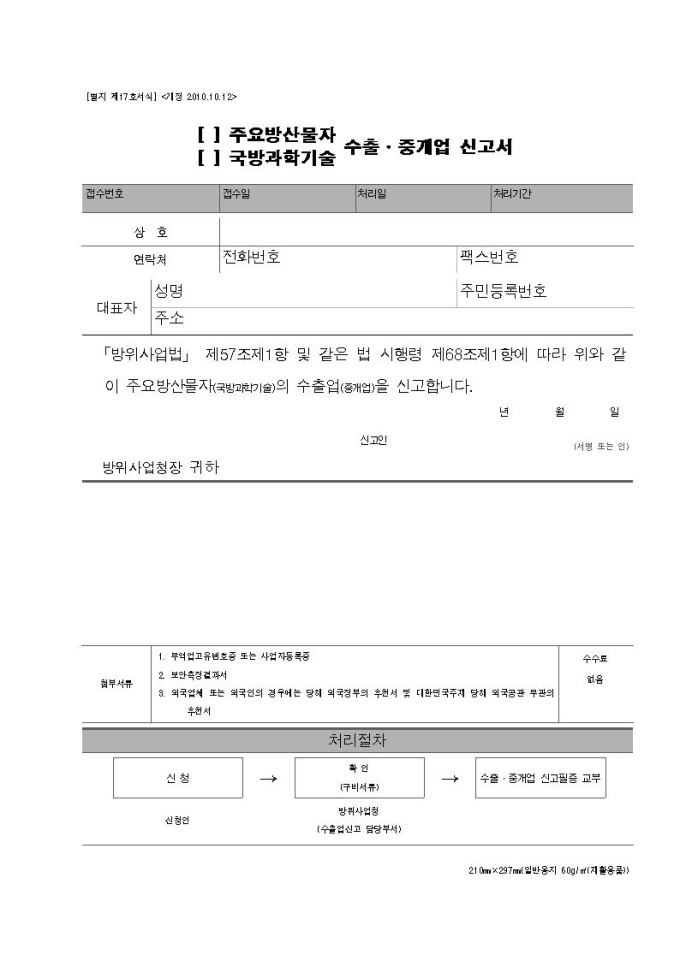주요방산물자(국방과학기술) 수출업 또는 중개업 신고