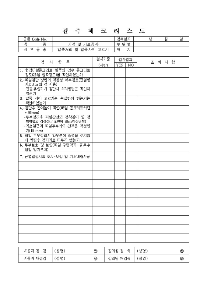지정및기초공사,말뚝처리및말뚝사이고르기 체크리스트 입니다.