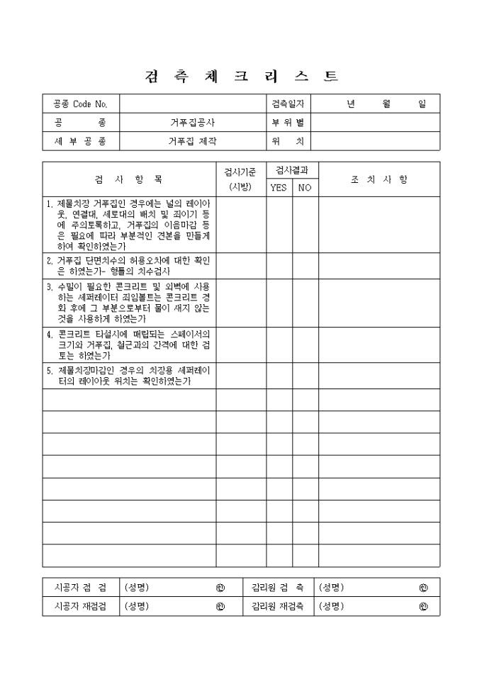 철근콘크리트공사,거푸집제작 체크리스트 입니다.