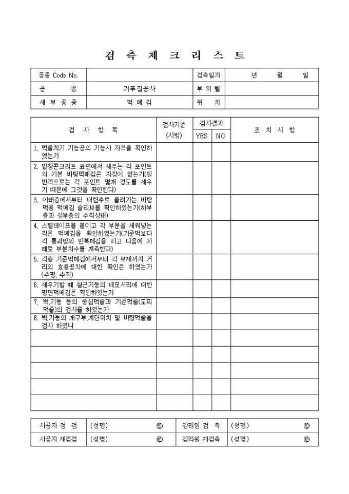 철근콘크리트공사,먹메김① 체크리스트 입니다.