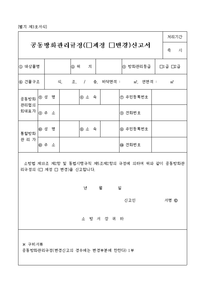소방법 제10조 제2항 및 동법시행규칙 제5조제2항의 규정에 의하여 공동방화관리규정의 ( 제정 변경)을 신고할 때 사용하는 양식입니다.