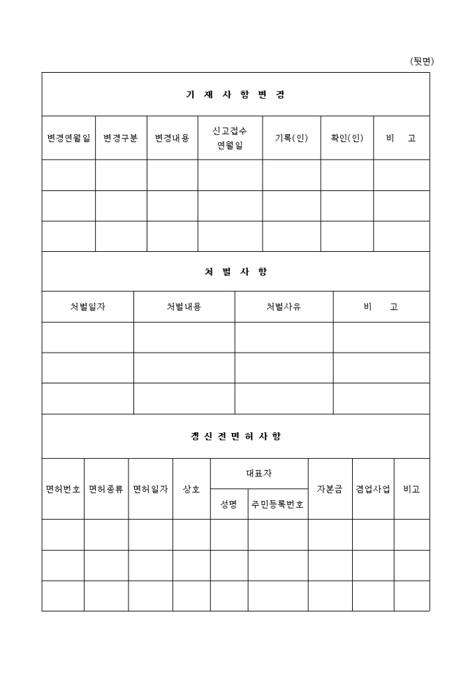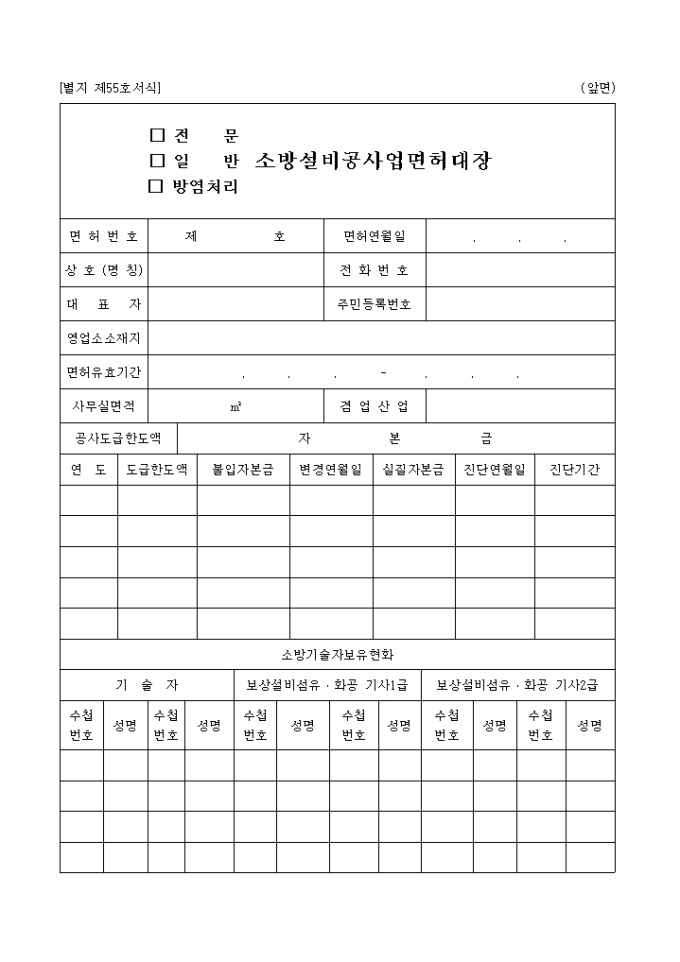 소방기술자 보유현황과 기재사항변경, 처벌사항, 갱신전면허사항드의 항목으로 구성되어 있는 (전문,일반,방염처리)소방설비공사업면허대장양식입니다.