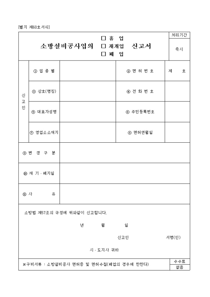 소방법 제57조의 규정에 소방설비 공사업의 휴업,재개업,폐업을 신고할 때 사용하는 양식입니다.