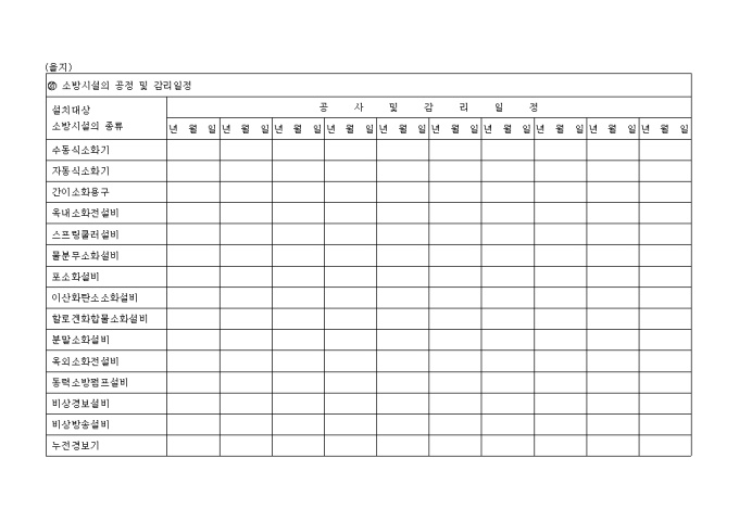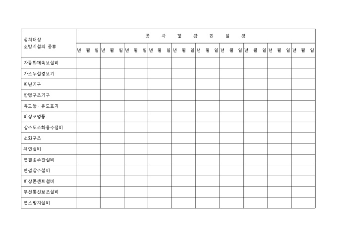 9,000원/월소방법시행규칙에 의한 소방공사감리계획서(을지)양식입니다. 소화기, 간이소화용구, 옥내소화전설비, 스프링쿨러설비, 물분무소화설비등의 설치대상 보상시설의 종류별로 공사 및 감리일정을 기록하도록 되어 있습니다.