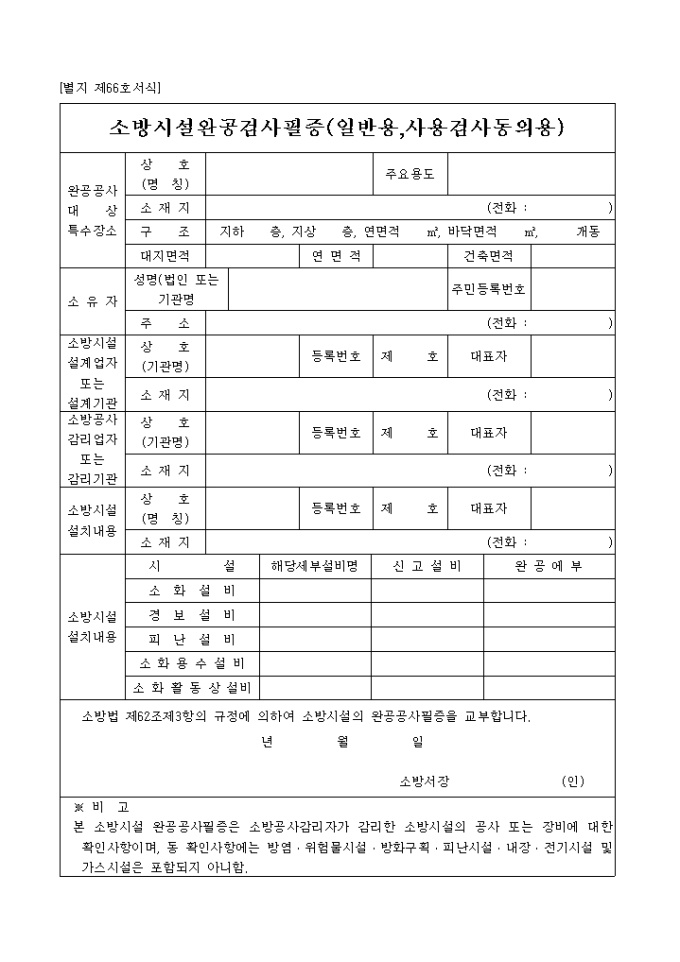 소방법 제62조제3항의 규정에 의하여 소방시설의 완공공사필증을 교부할 때 사용하는 양식입니다.