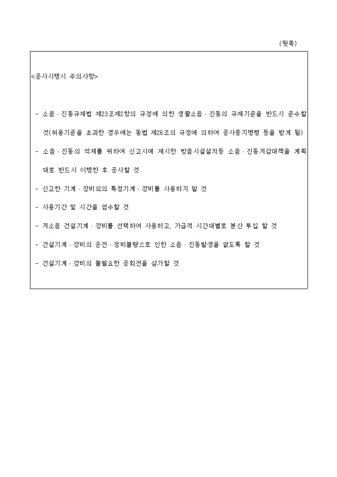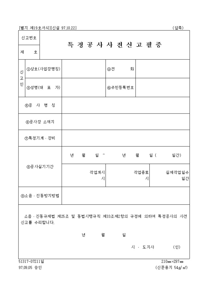 [별지 제19호서식] 소음·진동규제법 제25조 및 동법시행규칙 제33조제2항의 규정에 의하여 특정공사의 사전신고를 수리할 때 사용하는 양식입니다.