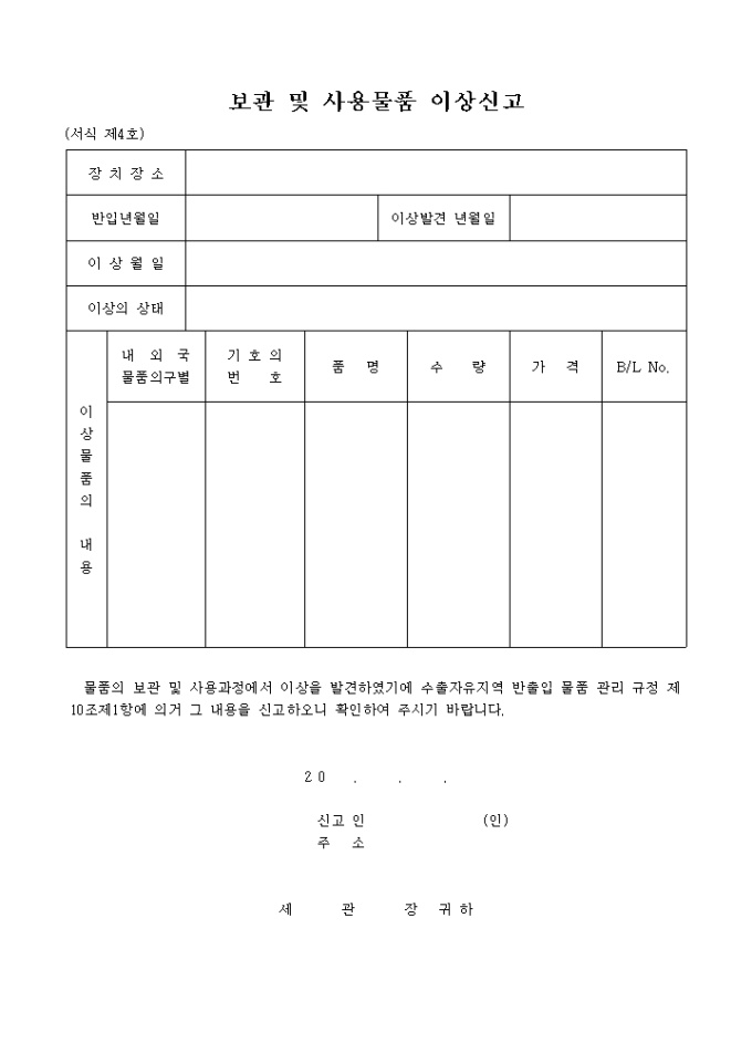 물품의 보관 및 사용과정에서 이상을 발견하였기에 수출자유지역 반출입 물품 관리 규정 제10조제1항에 의거 그 내용을 신고를 하고 확인을 의뢰하기 위한 양식입니다.