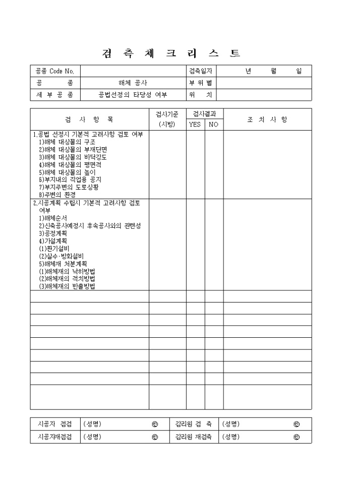 건축공사,해체공사,공법선정의타당성여부 체크리스트 입니다.