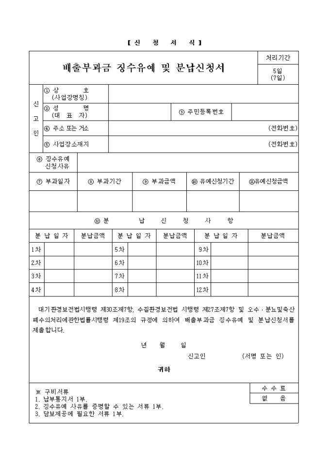 9,000원/월대기환경보전법시행령 제30조제7항, 수질환경보전법 시행령 제27조제7항 및 오수·분뇨및축산폐수의처리에관한법률시행령 제19조의 규정에 의하여 배출부과금 징수유예 및 분납을 신청할 때 사용하는 양식입니다.