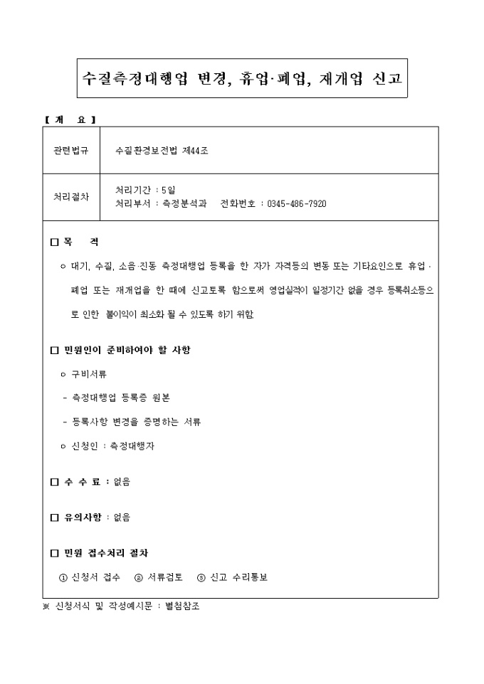 수질측정대행업변경, 휴업·폐업, 재개업신고