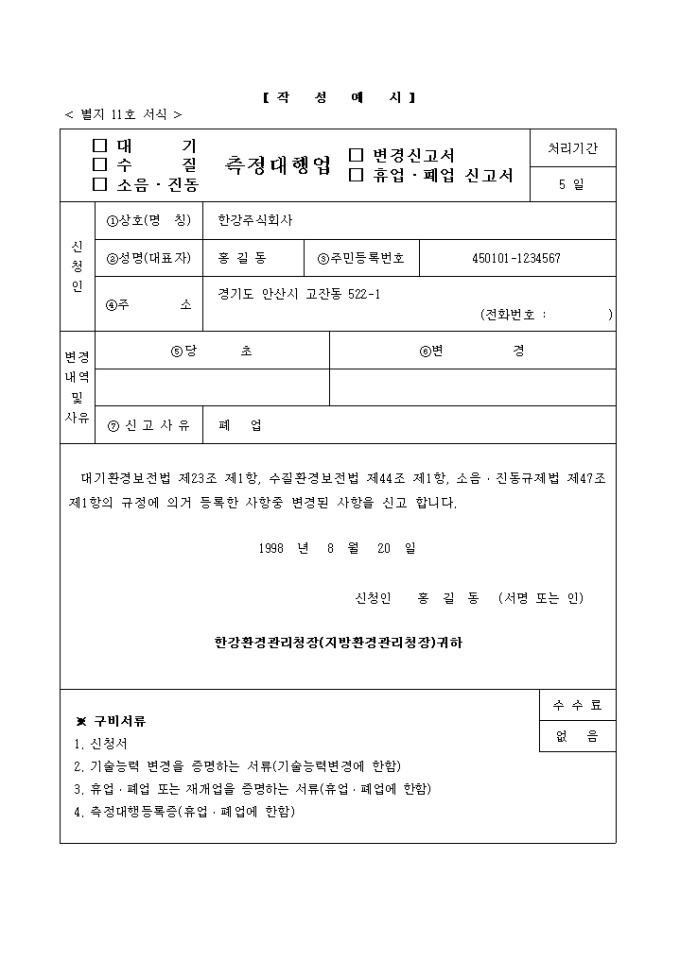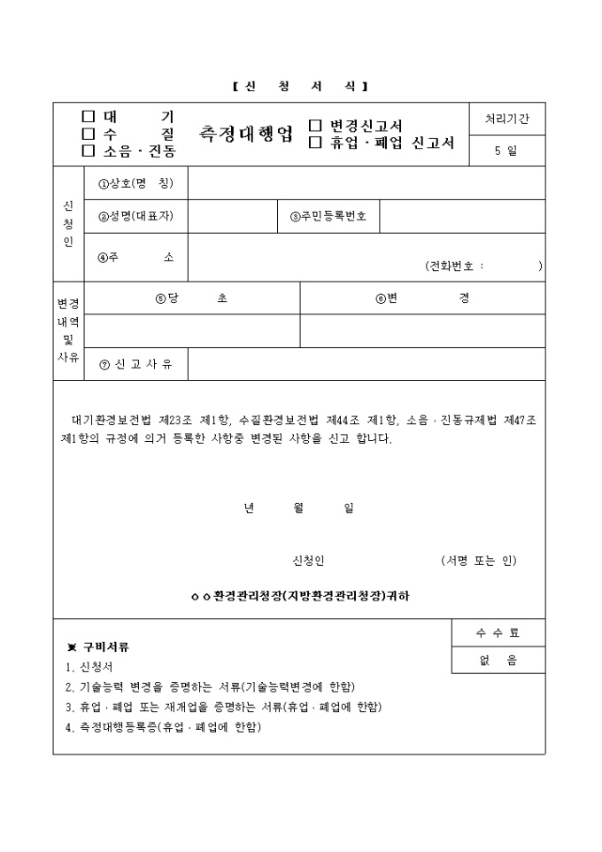 대기환경보전법 제23조 제1항, 수질환경보전법 제44조 제1항, 소음·진동규제법 제47조 제1항의 규정에 의거 등록한 사항중 변경된 사항을 신고 할 때 사용하는 양식입니다.