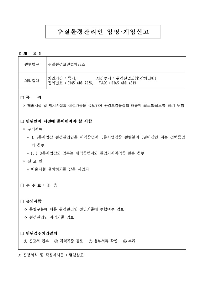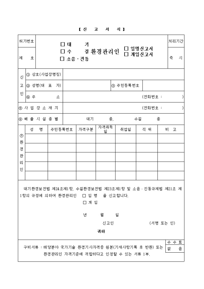 9,000원/월대기환경보전법 제24조제1항, 수질환경보전법 제23조제1항 및 소음 진동규제법 제21조 제1항의 규정에 의하여 환경관리인 임명, 개임을 신고할 때 사용하는 양식입니다.