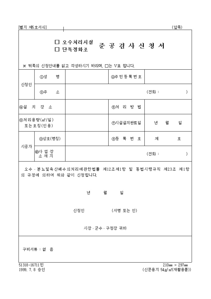 9,000원/월[별지 제5호서식] 오수·분뇨 및 축산폐수의처리에 관한 법률 제12조제1항 및 동법시행규칙 제23조 제1항의 규정에 의하여 오수처리시설, 단고정화조 준공검사를 신청할 때 사용하는 양식입니다.