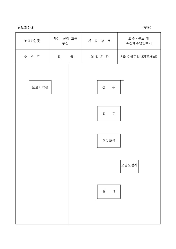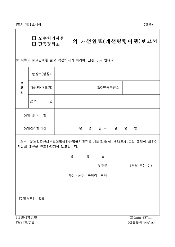 오수, 분뇨및축산폐수의처리에관한법률시행규칙 제31조제4항, 제33조제1항의 규정에 의하여 시설의 개선을 완료하였기에 이를 보고할 때 사용하는 양식입니다.