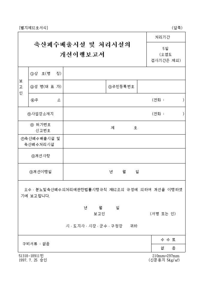오수, 분뇨및축산폐수의처리에관한법률시행규칙 제62조의 규정에 의하여 개선을 이행하였기에 이를 보고할 때 사용하는 양식입니다.