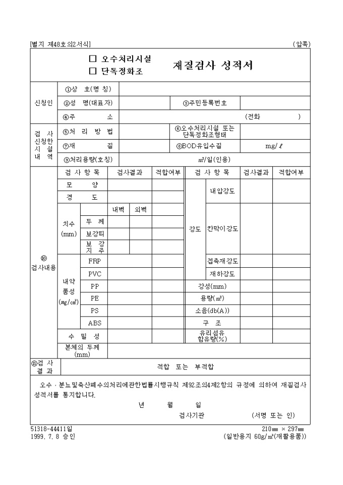 오수 분뇨및축산폐수의처리에관한법률시행규칙 제92조의4제2항의 규정에 의하여 오수처리시설, 단독정화조의 재질검사성적서를 통지할 때 사용하는 양식입니다.