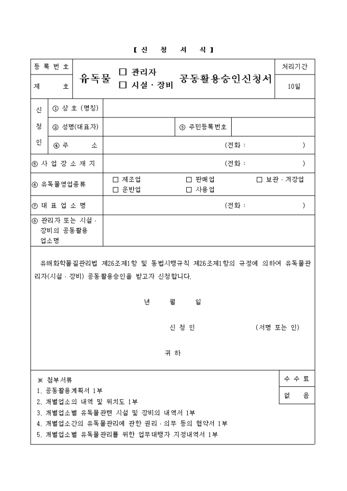 유해화학물질관리법 제26조제1항 및 동법시행규칙 제26조제1항의 규정에 의하여 유독물관리자(시설 장비) 공동활용승인을 받고자 신청할 때 사용하는 양식입니다.