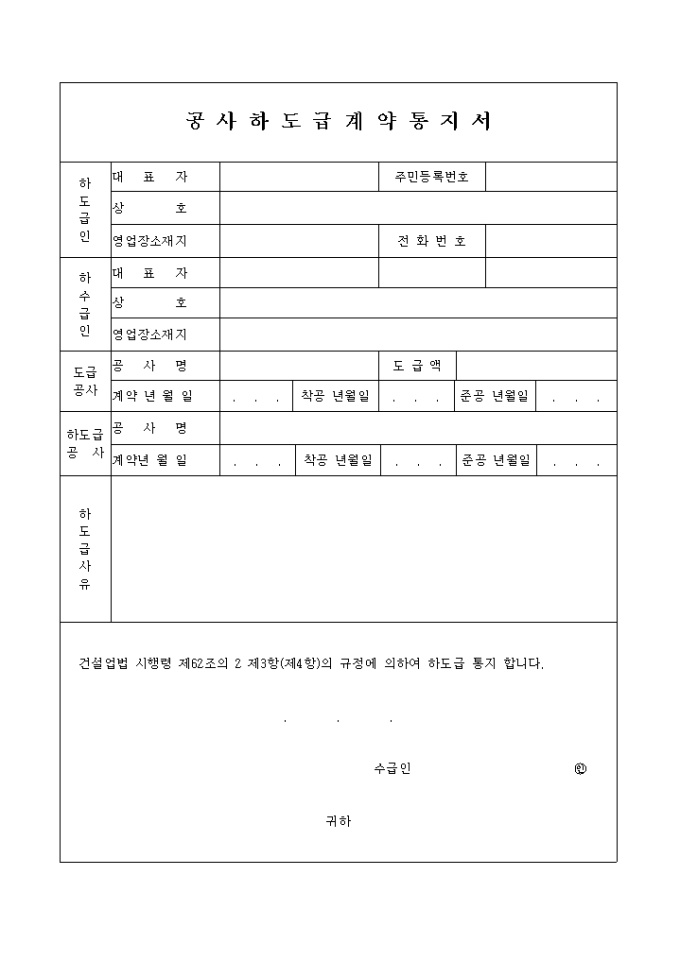 9,000원/월하도급인,하수급인,도급공사,하도급공사,하도급사유를 기록하는 공사하도급 계약 통지서입니다.