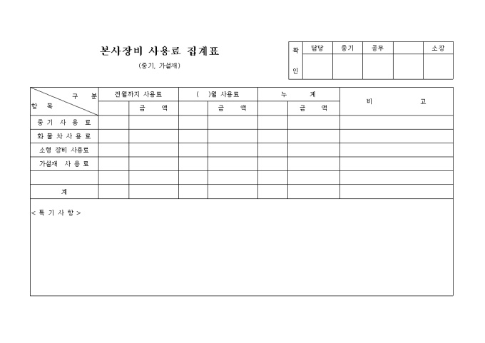 9,000원/월중기사용료,화물차사용료,소형 장비 사용료,가설재 사용료의 전월까지 사용료,월 사용료,누계를 기록하는 전기관련-본사장비사용료집계표(중기,가설재)입니다.