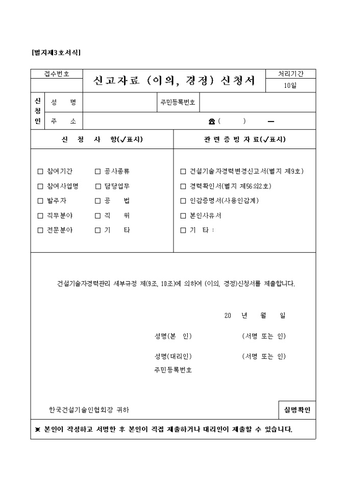 건설기술자경력관리 세부규정 제(9조, 10조)에 의하여 (이의, 경정)신청을 할 때 사용하는 양식입니다.