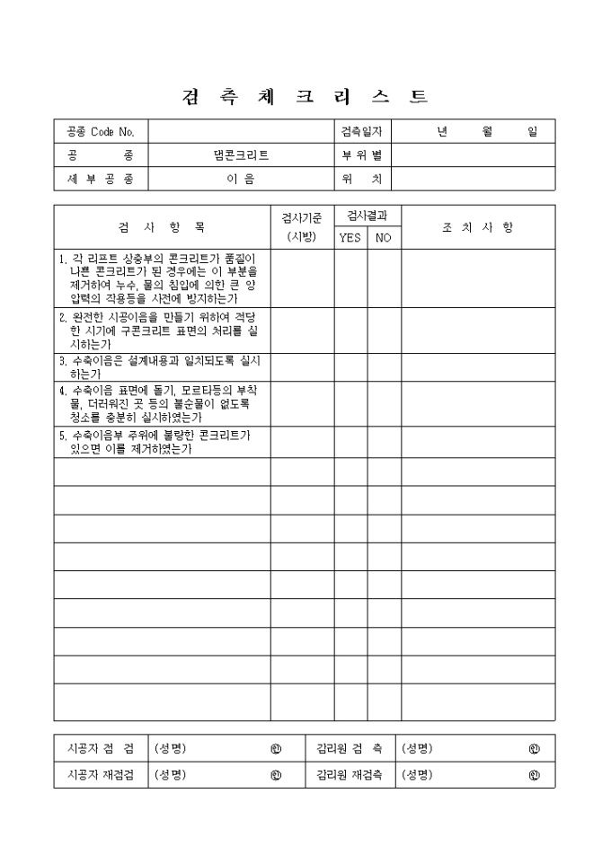 9,000원/월일반사항,댐콘크리트,이음 검측체크 리스트입니다.