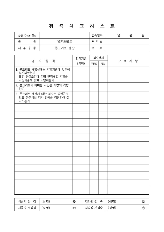 일반사항,댐콘크리트,콘크리트생산② 검측체크리스트 입니다.