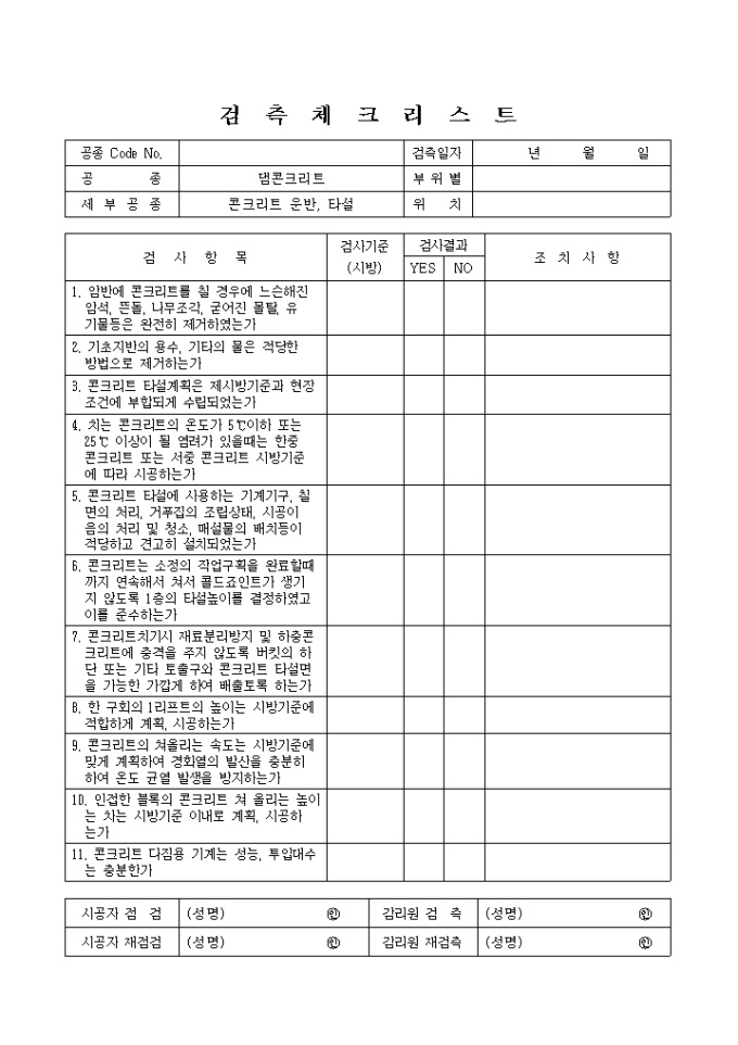 일반사항,댐콘크리트,콘크리트운반타설 검측 체크리스트입니다.