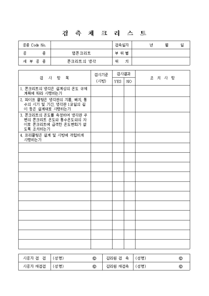 9,000원/월일반사항,댐콘크리트,콘크리트의냉각 검측 체크 리스트입니다.