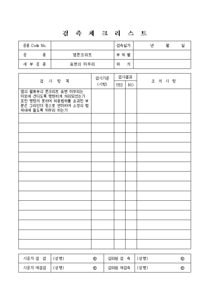 일반사항,댐콘크리트,표면의마무리 검측 체크 리스트입니다.