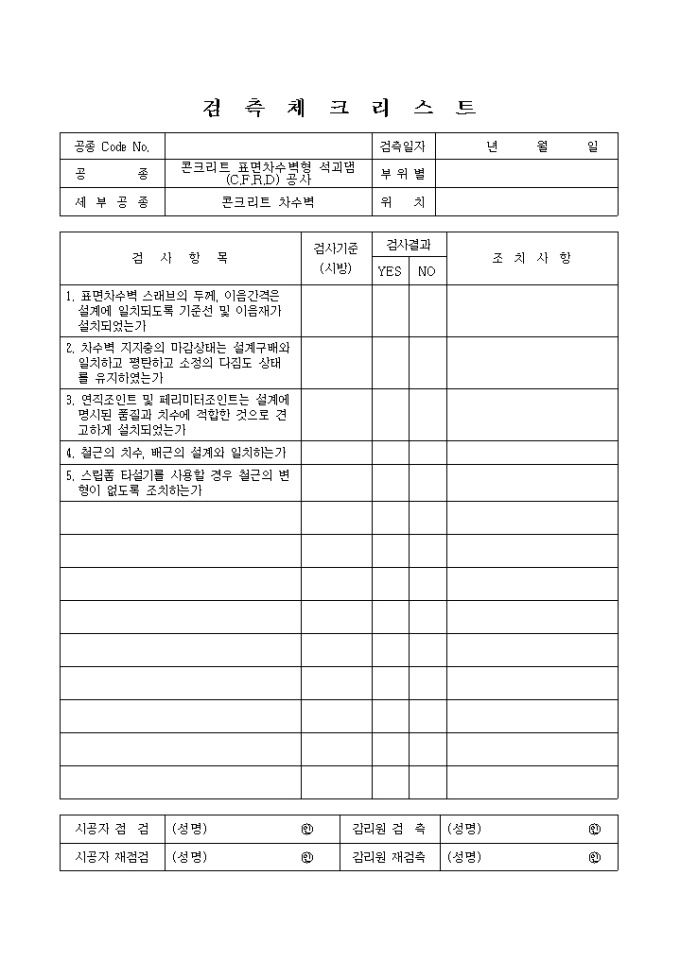 9,000원/월일반사항,콘크리트표면차수벽석괴댐(C.F.R.D)공사,콘크리트차수벽 검측체크 리스트입니다. 검 사 항 목 1. 표면차수벽 스래브의 두께, 이음간격은 설계에 일치되도록 기준선 및 이음재가 설치되었는가 2. 차수벽 지지충의 마감상태는 설계구배와 일치하고 평탄하고 소정의 다짐도 상태를 유지하였는가 3. 연직조인트 및 페리미터조인트는 설계에 명시된 품질과 치수에 적합한 것으로 견고하게 설치되었는가 .......................