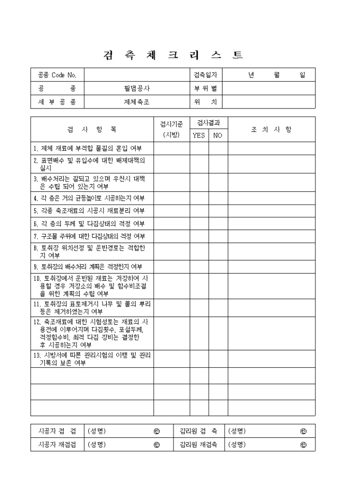 일반사항,필댐공사,제체축조 검측 체크리스트 입니다. 검 사 항 목 1. 제체 재료에 부적합 물질의 혼입 여부 2. 표면배수 및 유입수에 대한 배제대책의 실시 3. 배수처리는 잘되고 있으며 우천시 대책은 수립 되어 있는지 여부 4. 각 층은 거의 균등높이로 시공하는지 여부 5. 각종 축조재료의 시공시 재료분리 여부 6. 각 층의 두께 및 다짐상태의 적정 여부 ................