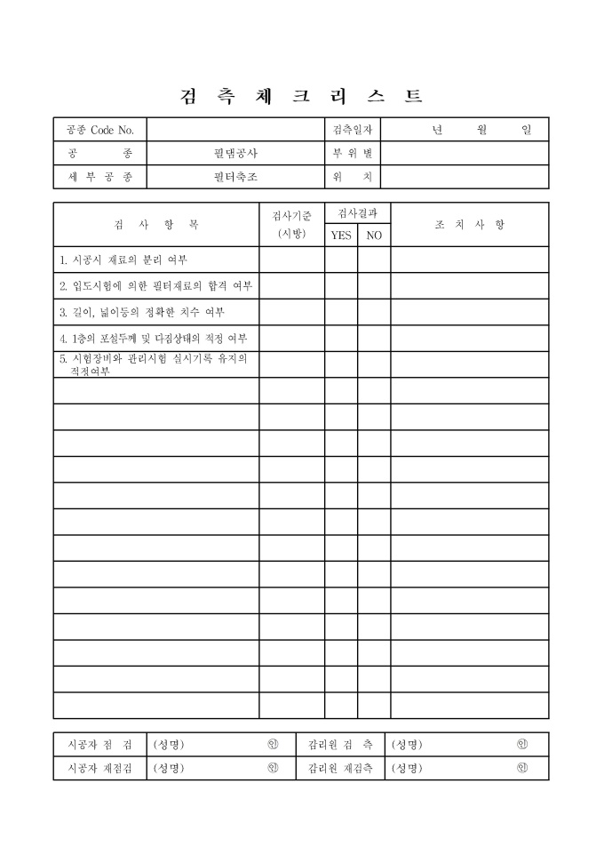 일반사항,필댐공사,필터축조 검측 체크리스트입니다.