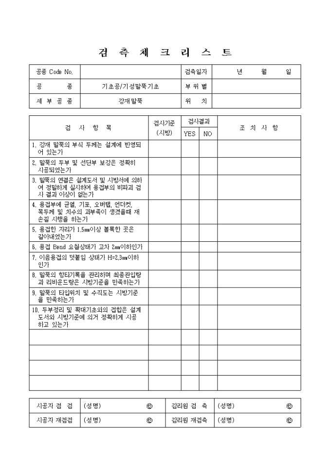 9,000원/월일반토목공사,기초공,기성말뚝기초-강재말뚝 검측 체크 리스트입니다.